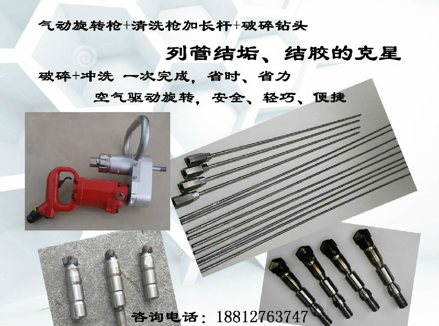 柏瑞特BRTURN换热器列管清洗系统由气动旋转清洗枪、清洗枪加长杆和专用破碎钻头三部分组成,是针对换热器列管结垢、结胶的专用清洗设备,使用时需连接高压水和压缩空气。列管清洗系统携带高压水,同时空气驱动枪杆和钻头进行旋转,破碎列管内壁硬垢和胶质层,并通过钻身孔隙喷射出的高压水对管壁进行冲洗,破碎、冲洗一次完成,节约了施工时间,降低了施工成本。